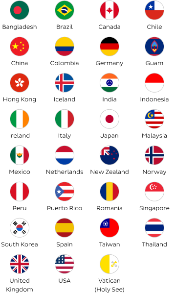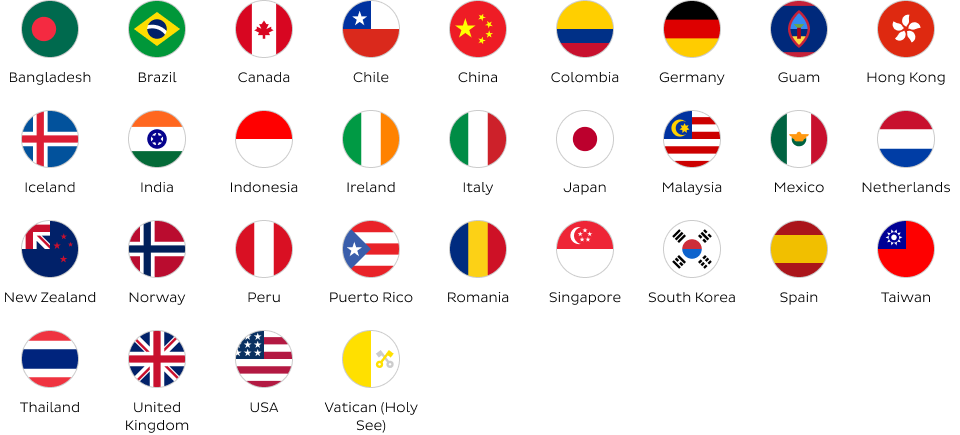 Destinations include Bangladesh, Brazil, Canada, Chile, China, Colombia, Germany, Guam, Hong Kong, Iceland, India, Indonesia, Ireland, Italy, Japan, Malaysia, Mexico, Netherlands, New Zealand, Norway, Peru, Puerto Rico, Romania, Singapore, South Korea, Spain, Taiwan, Thailand, United Kingdom, USA and the Vatican.